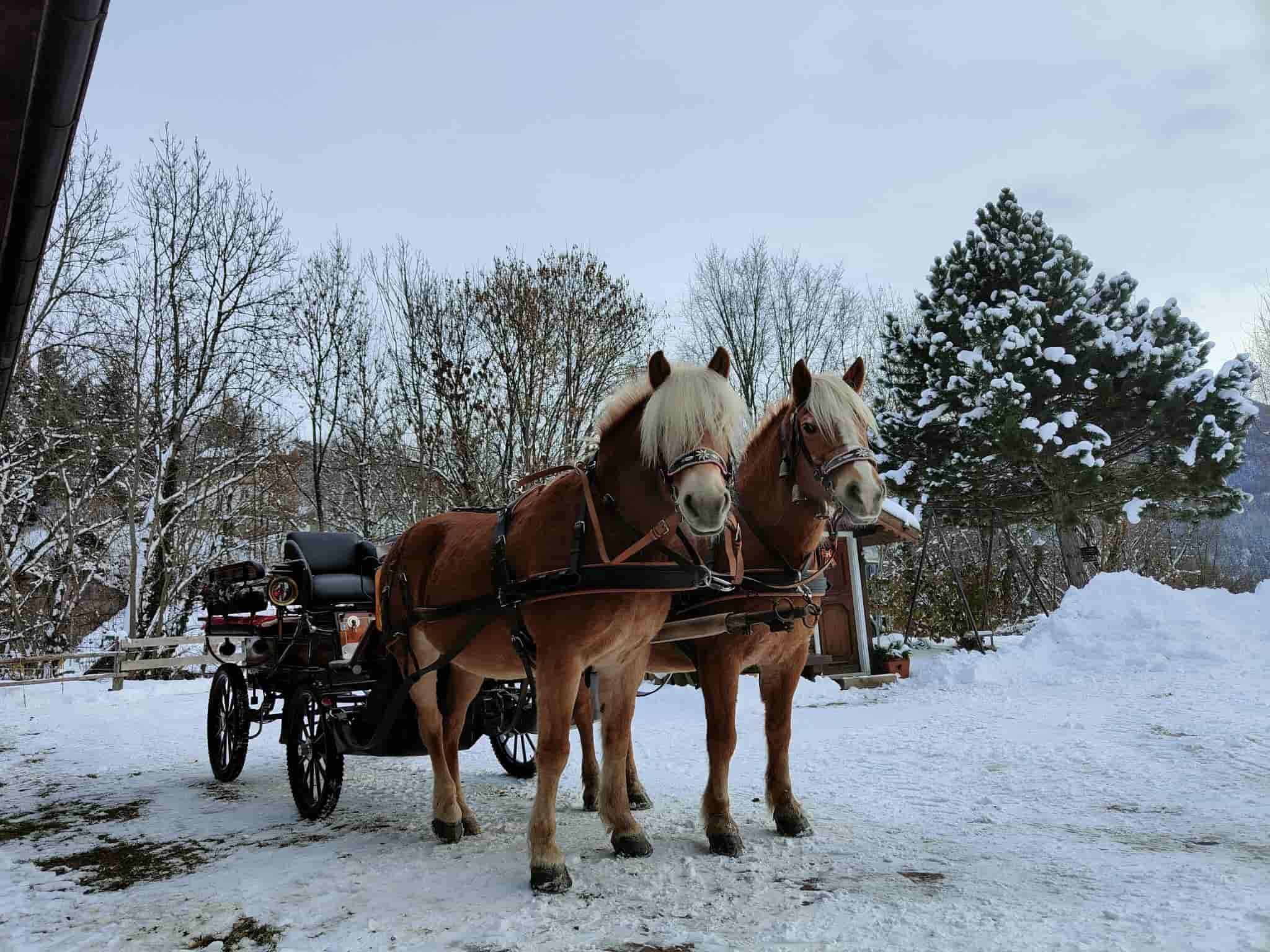 Un giro in carrozza trainata da cavalli Haflinger è ideale per famiglie, amici e coppie che vogliono godersi il panorama, sia nel periodo invernale che estivo.
