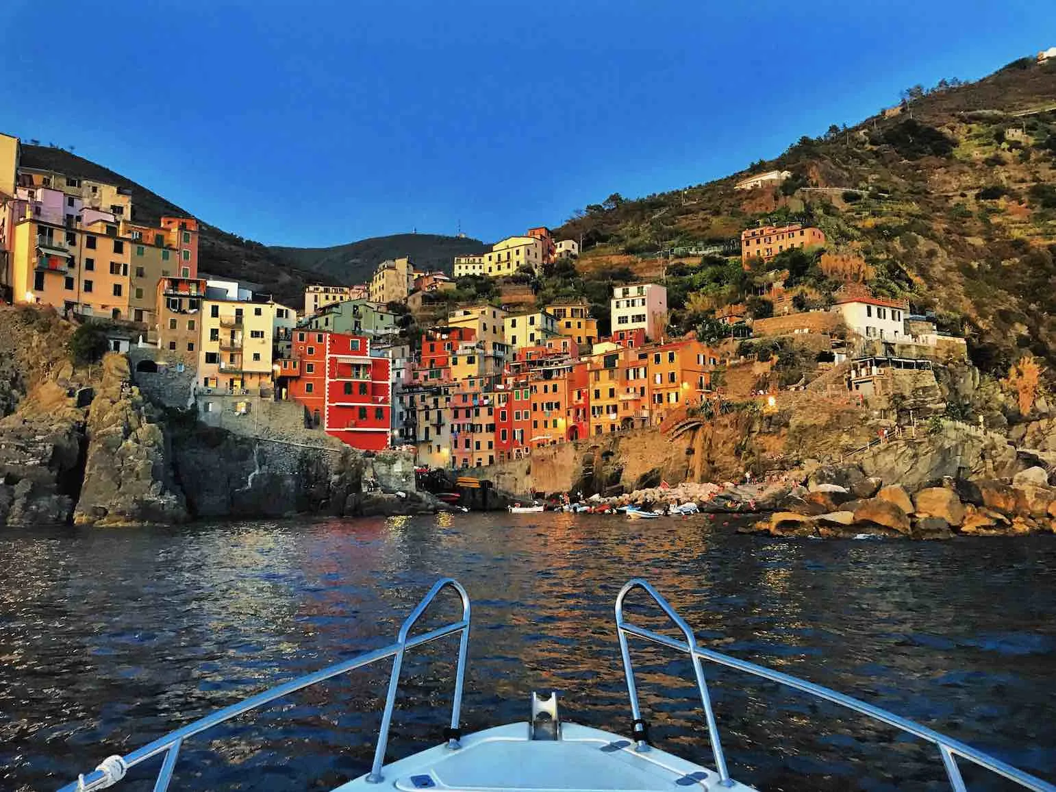 Imbarcati in un boat tour al tramonto alle Cinque Terre con aperitivo, di 2 ore, con partenza da Riomaggiore.