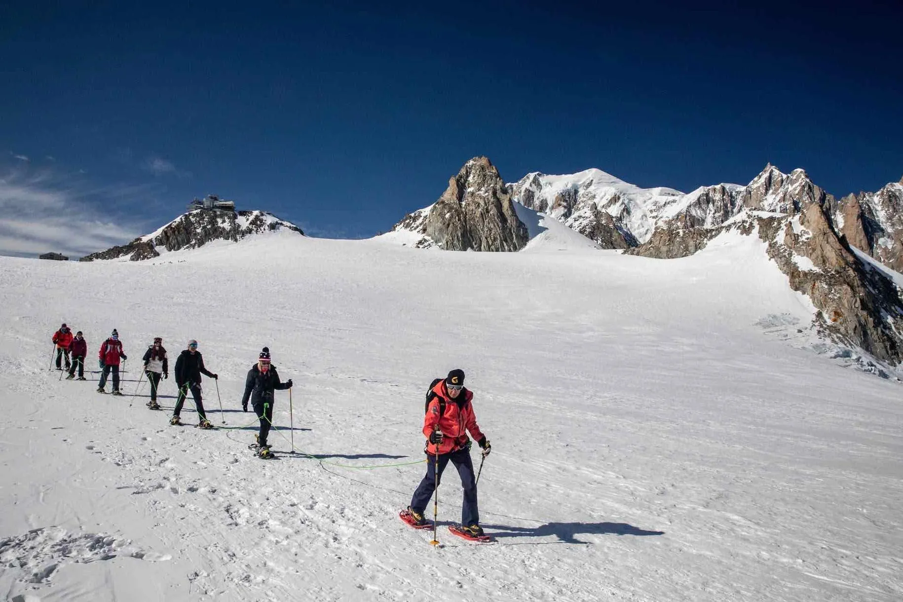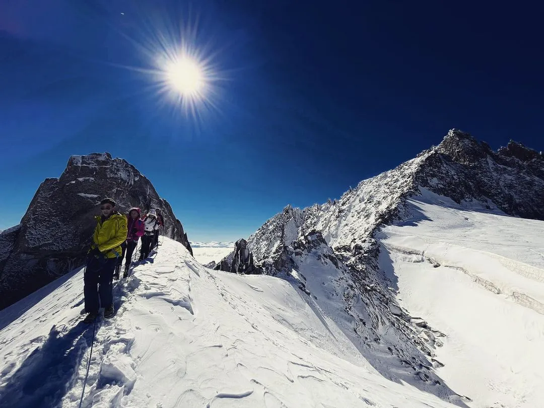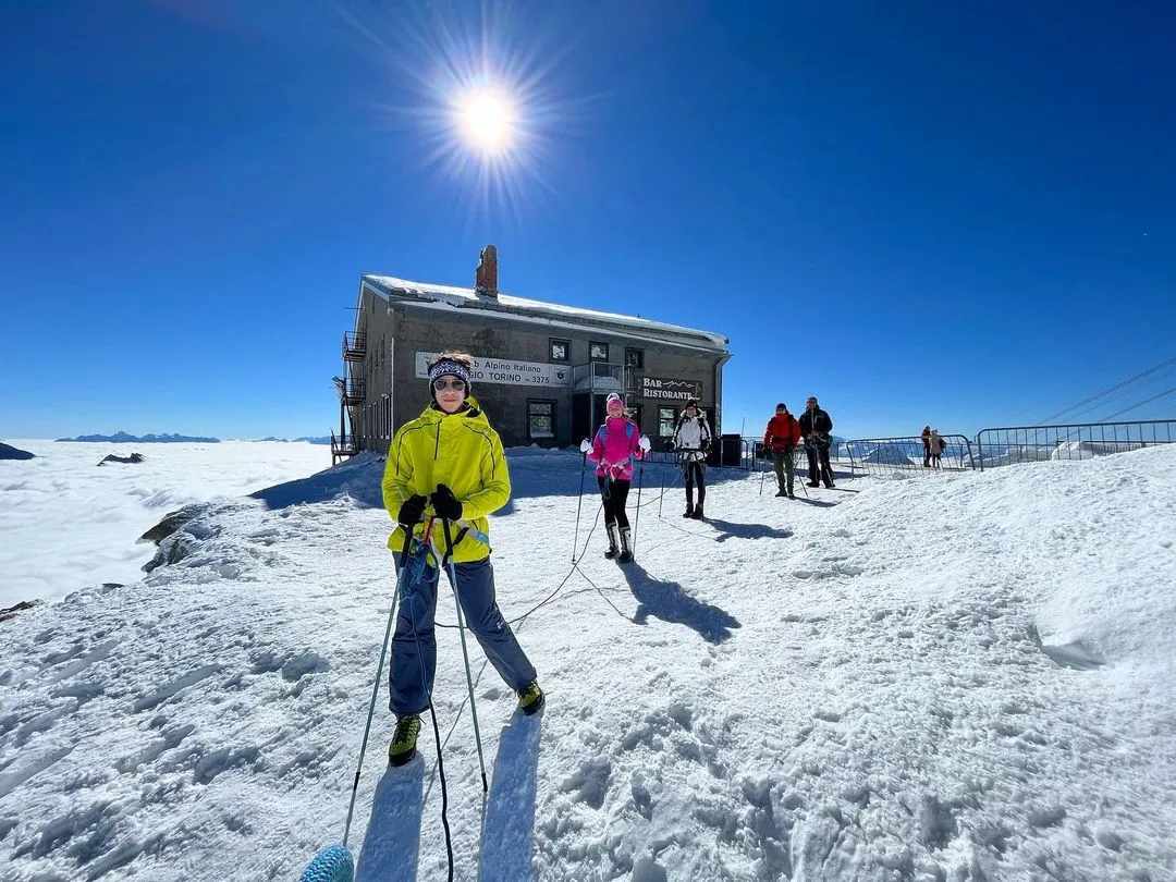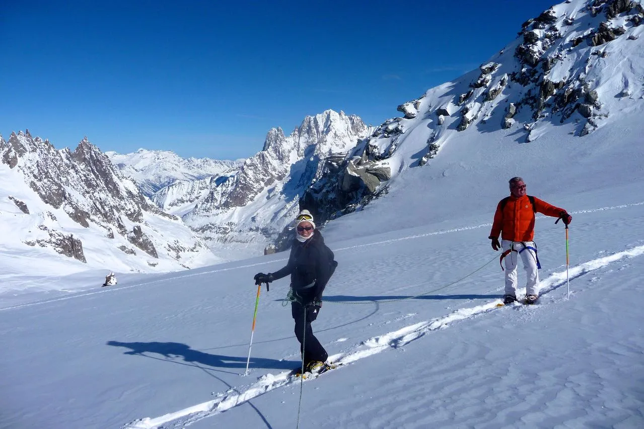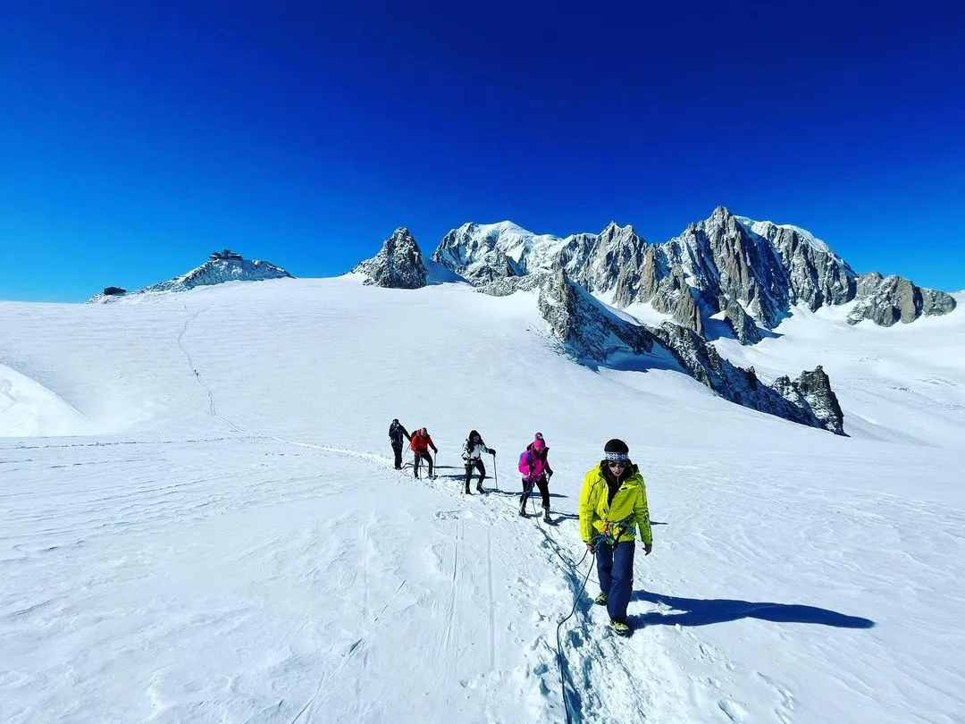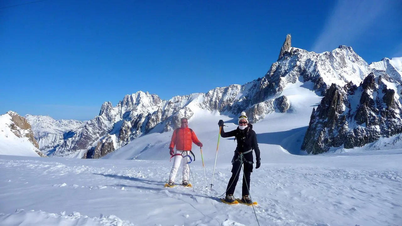 La ciaspolata sul Monte Bianco con funivia Skyway a Courmayeur è una gita in ciaspole sul massiccio del Monte Bianco, al Colle del Gigante. Camminerete su un ghiacciaio insieme a una guida alpina, legati tra di voi e passeggerete a oltre 3.500m. Un'esperienza unica nel suo genere!