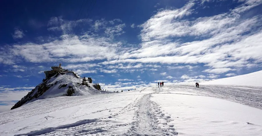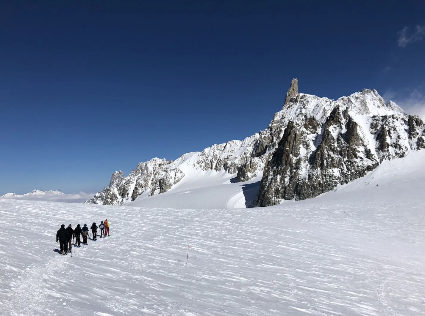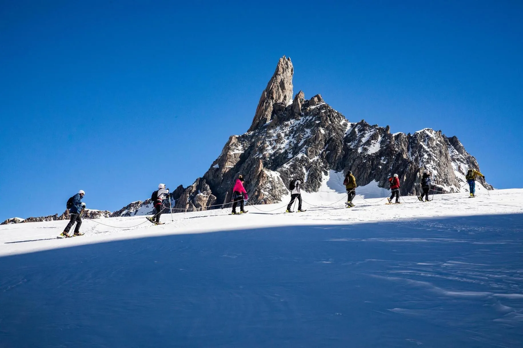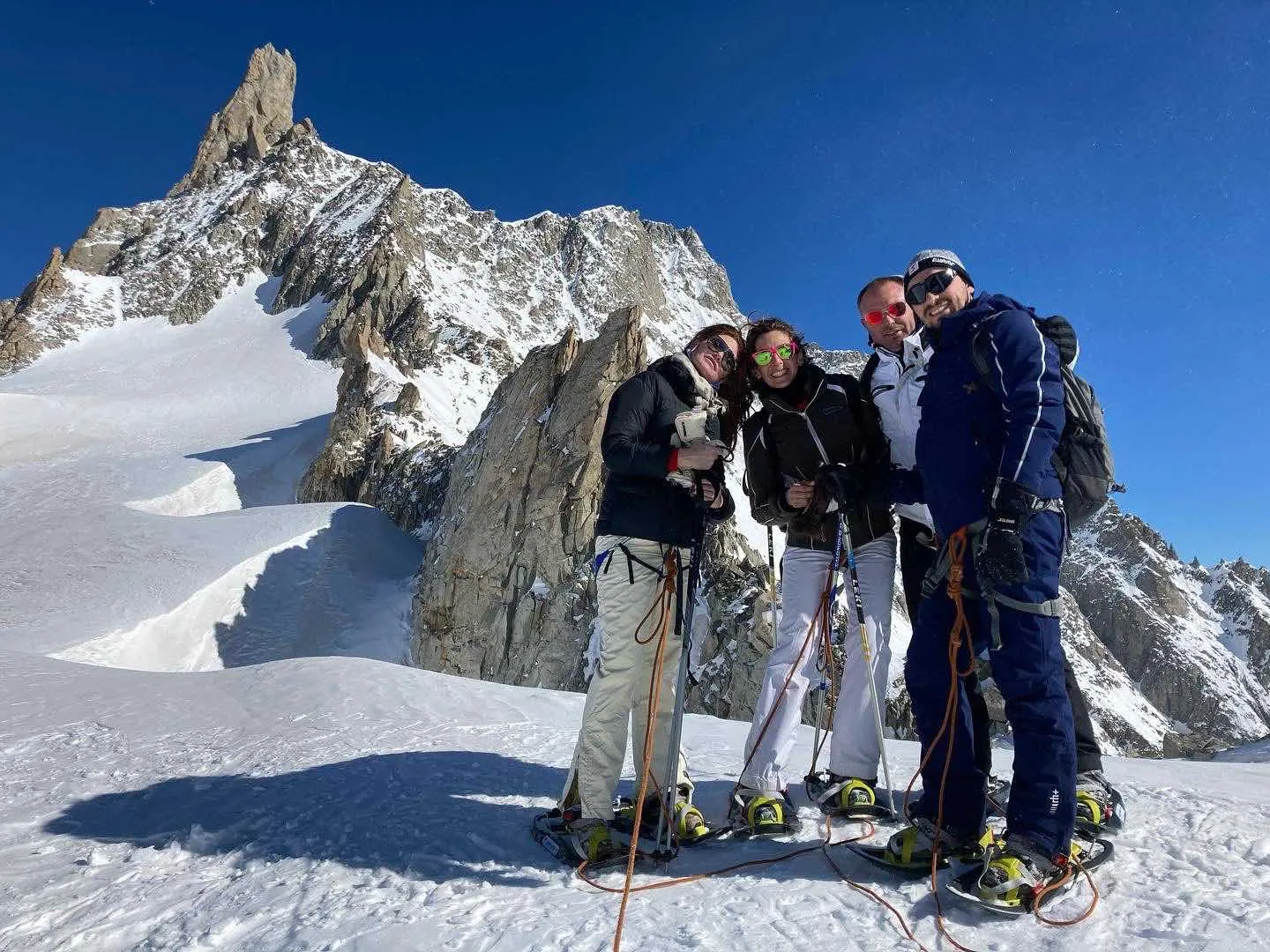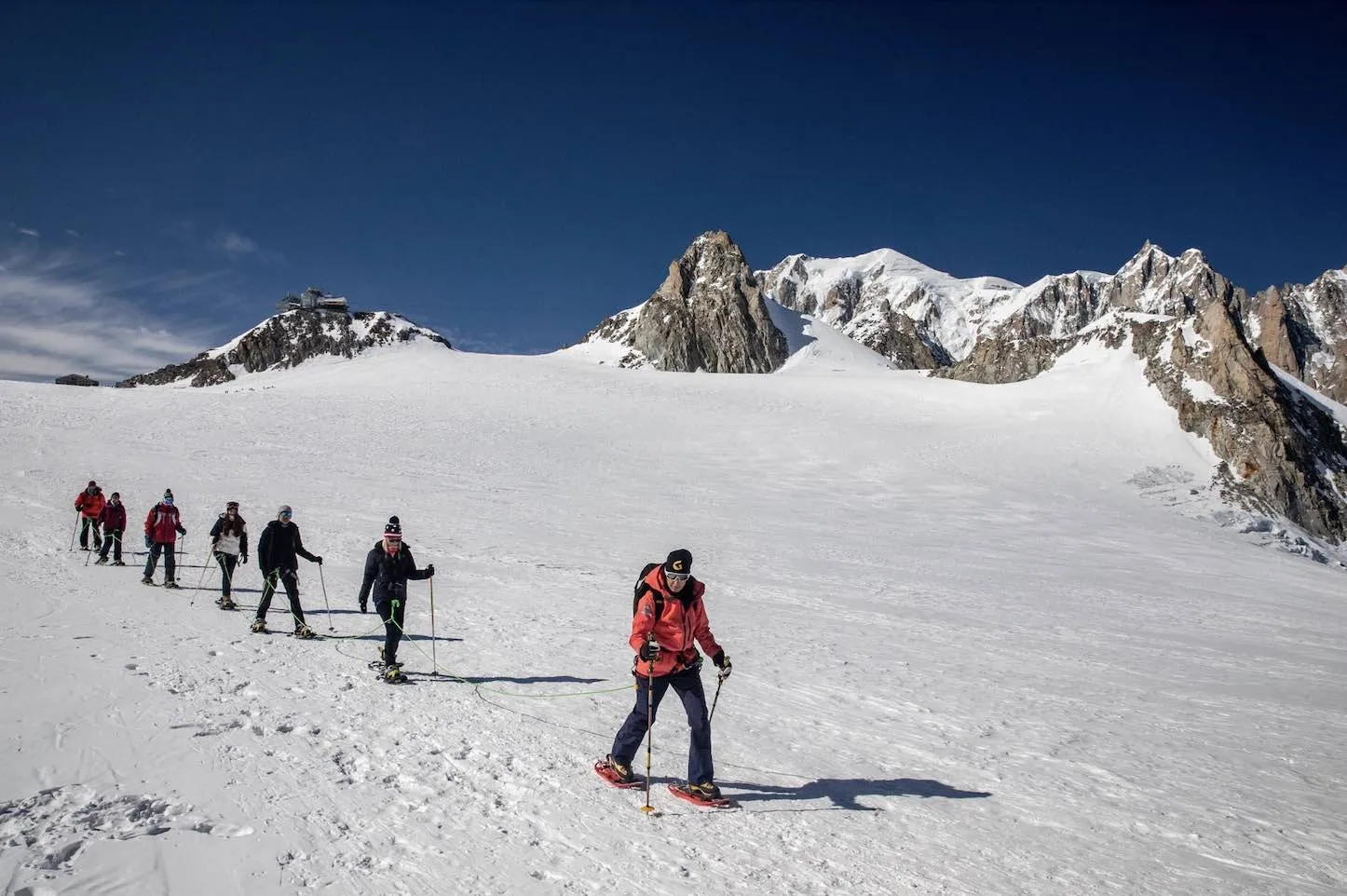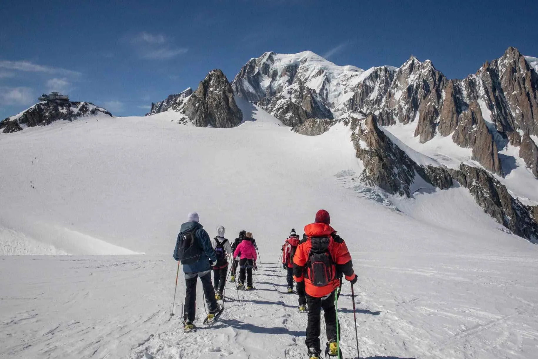 La ciaspolata sul Monte Bianco con funivia Skyway a Courmayeur è una gita in ciaspole sul massiccio del Monte Bianco, al Colle del Gigante. Camminerete su un ghiacciaio insieme a una guida alpina, legati tra di voi e passeggerete a oltre 3.500m. Un'esperienza unica nel suo genere!