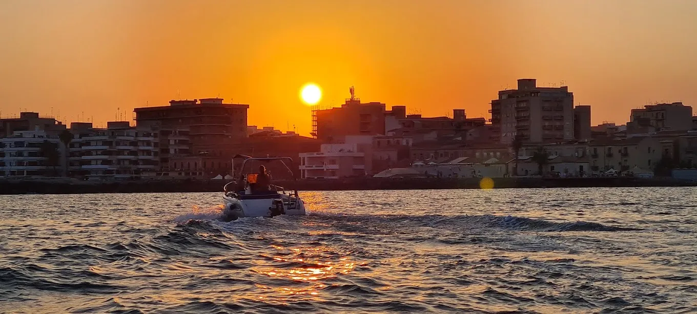 Trascorri una serata in barca, ammirando il tramonto che cala sull'Isola di Ortigia.