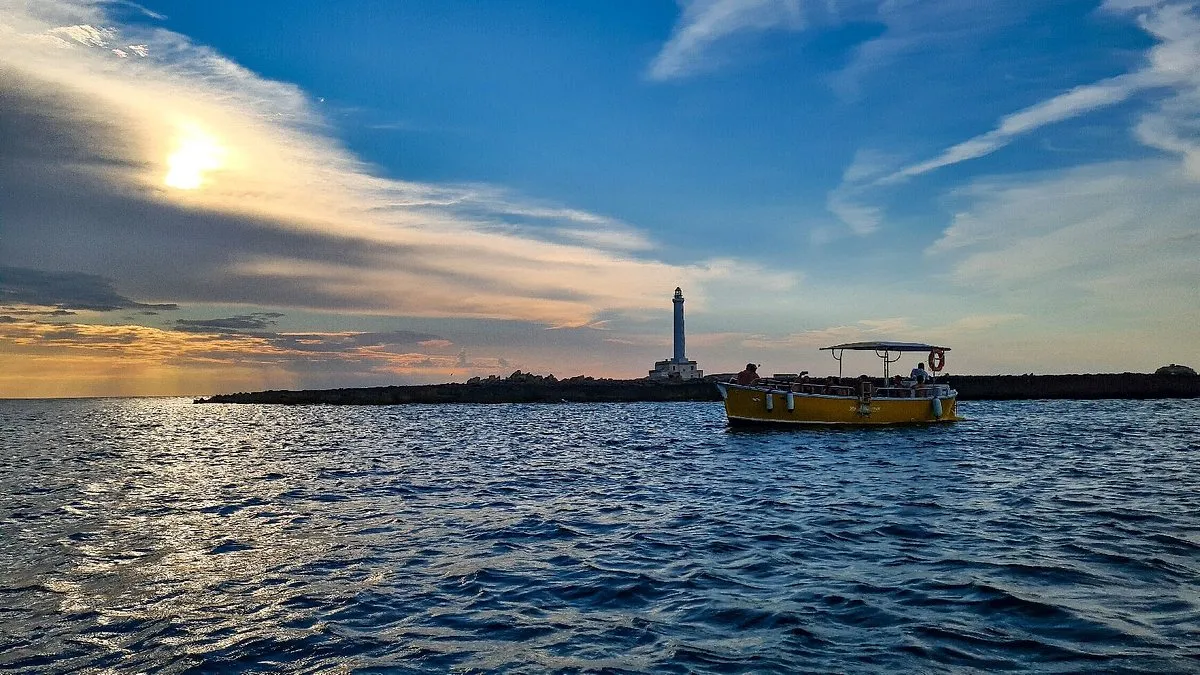 Durante questo tour al tramonto, la flotta si raduna vicino all'Isola, offrendo uno spettacolo del sole rosso fuoco che lentamente scompare dietro il mare, mescolandosi con il cielo. Durante l’escursione vi verrà offerto un aperitivo a base di stuzzichini salentini accompagnati da un drink.