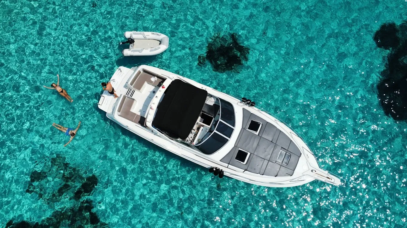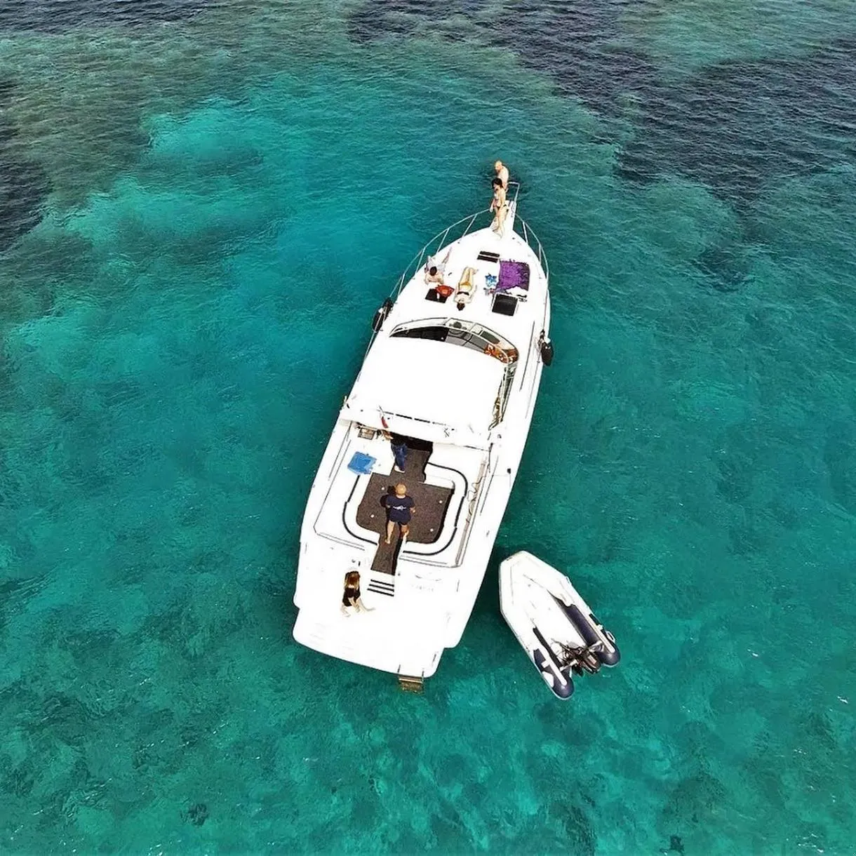 Il motoscafo è dotato di un ampio prendisole a prua e comode sedute a poppa. È presente anche un'area ombreggiata per i pasti, una piccola spiaggia di poppa con scaletta di risalita, un tender disponibile, due comodi divani, cucina e bagno.