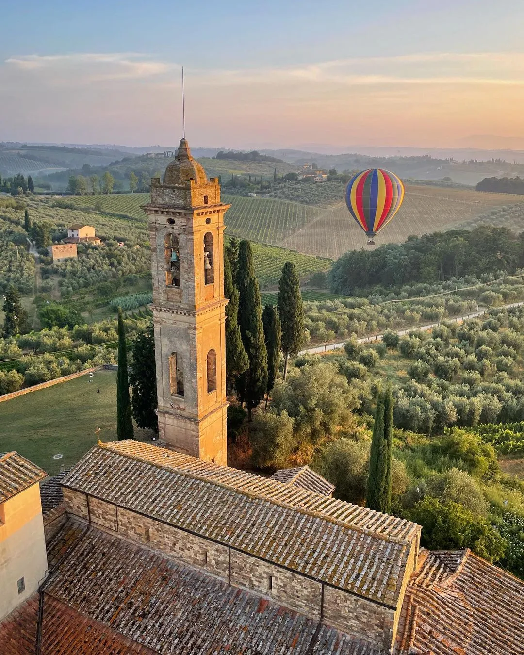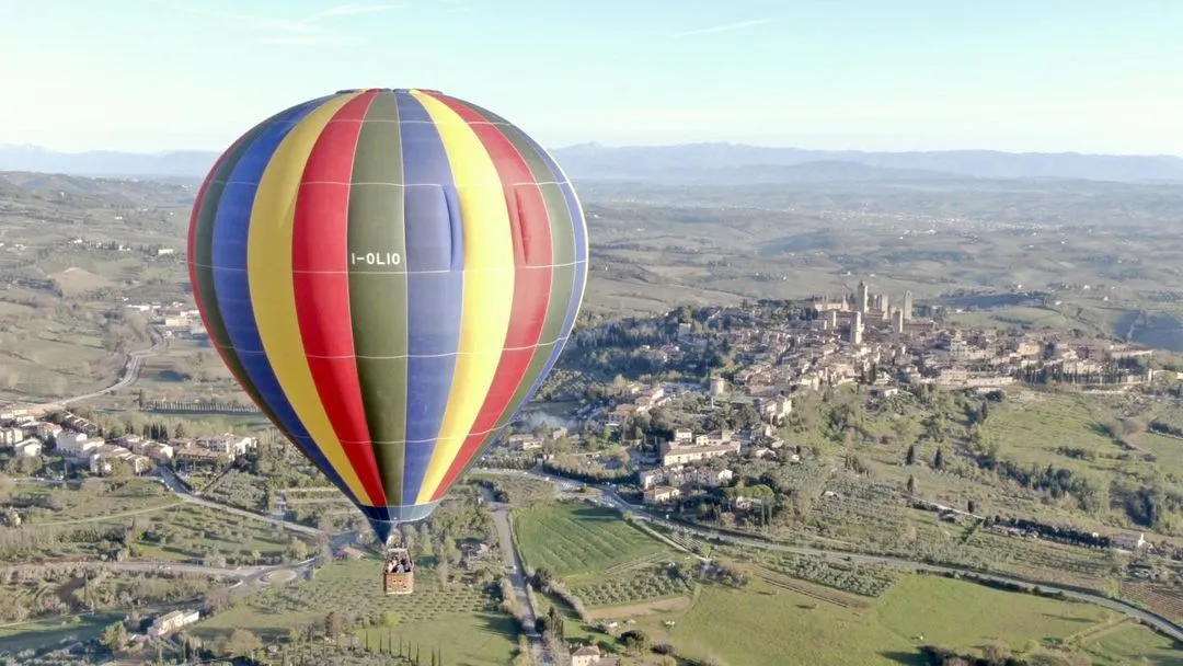 Si decolla nelle zone di San Gimignano e potrete ammirare fin da subito il borgo che è tra i più rinomati della Toscana. Una volta arrivati in quota avrete il panorama su tutta la campagna toscana caratterizzata dalle vigne e ulivi. In lontananza potrete anche vedere gli appennini tra cui le vette bianche caratterizzate dal Marmo di Carrara.