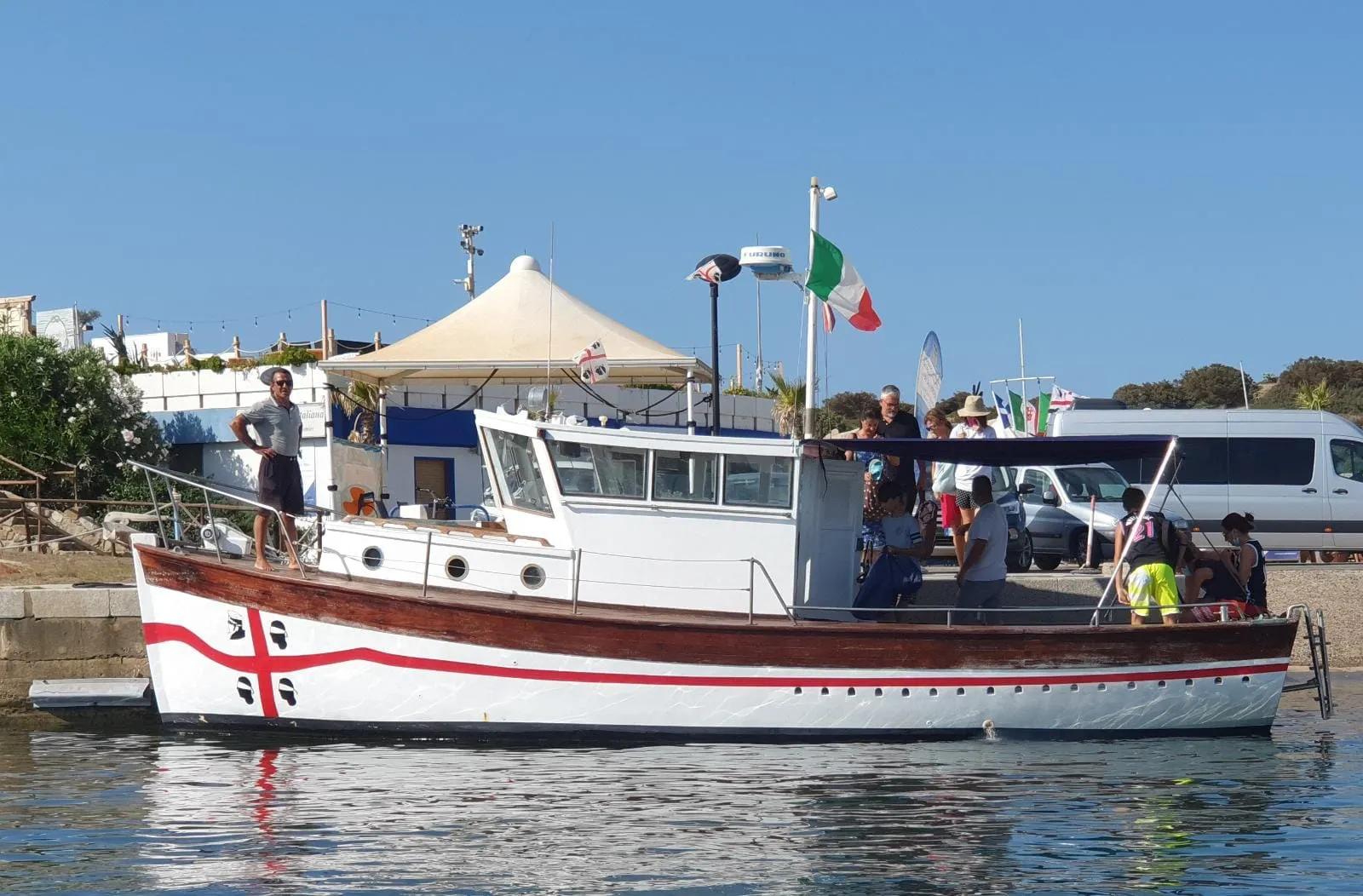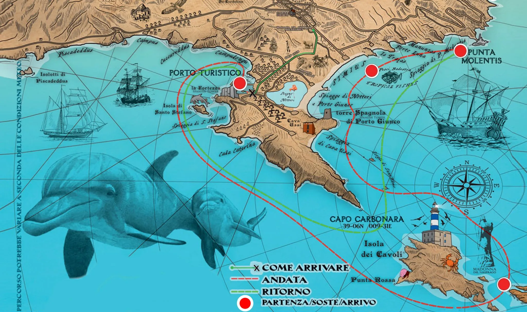 La prima sosta è all'Isola dei Cavoli e Baia della Madonna del Naufrago, dove potrete ammirare la statua della Vergina posta a 11 metri sul fondale marino. Si prosegue poi alla secca dei pesci Balestra, questa sosta è la più bella per gli amanti dello snorkeling.