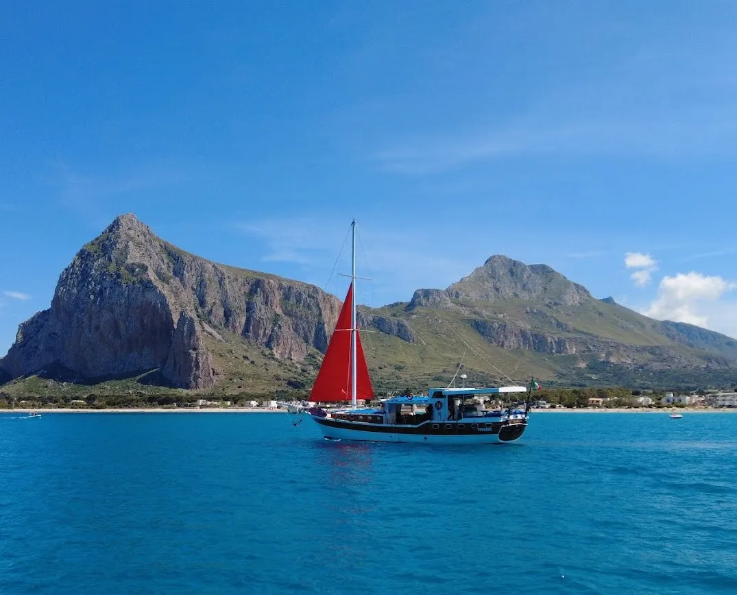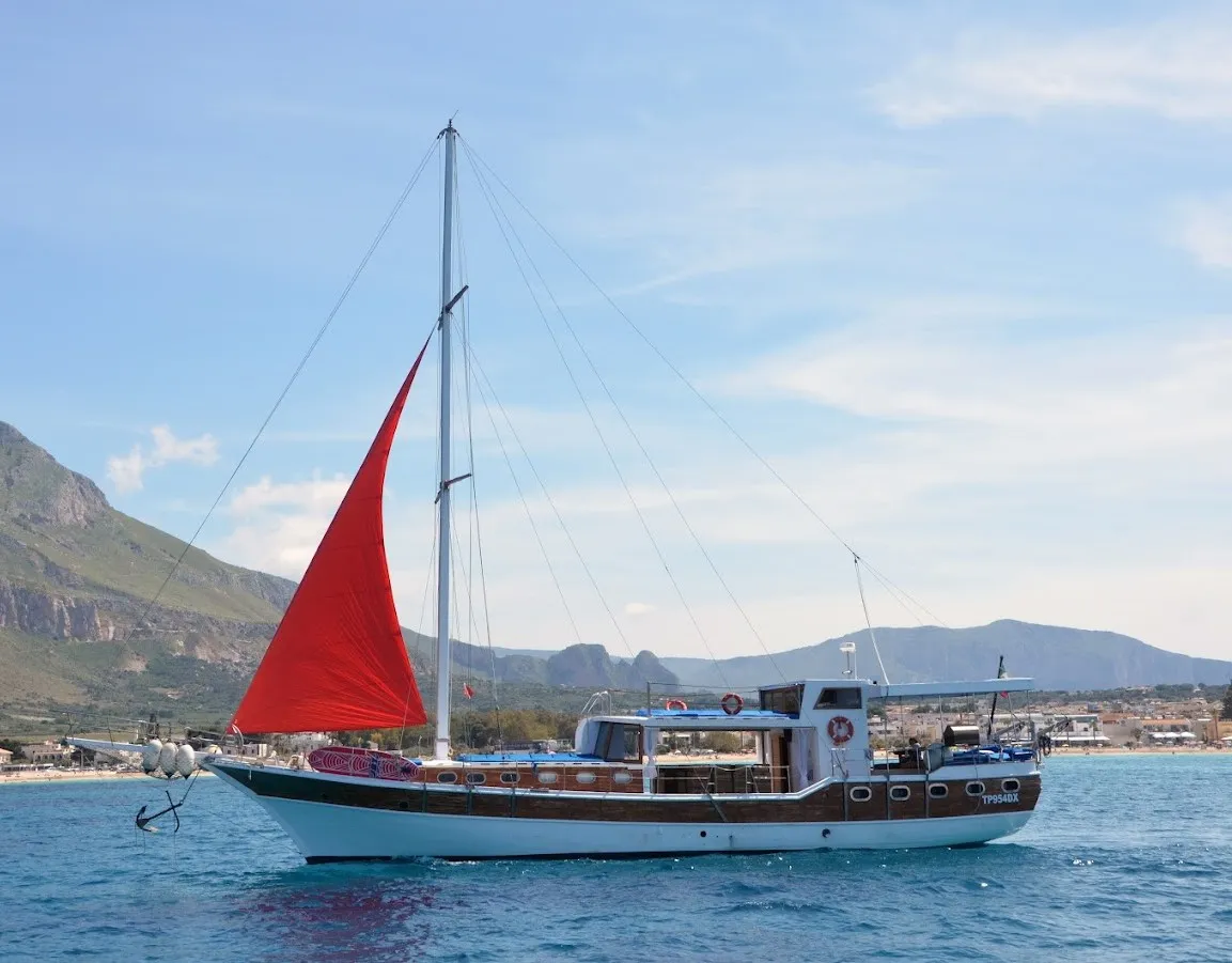 Vivi un'esperienza unica nel Mediterraneo in Sicilia a bordo di un caicco, esplorando la Riserva Naturale dello Zingaro e gustando un pranzo a bordo a base di prodotti tipici siciliani.