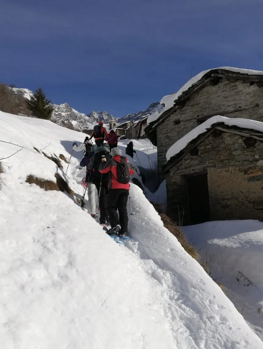 Alle 8.30 dal punto d'incontro raggiungerete Borgata Montone a 1538m, dove l'esperienza ha effettivamente inizio. La gita di circa 5.5 chilometri continua dirigendovi verso l'Alpe Cà Bianca a 1942m percorrendo un magico lariceto innevato.