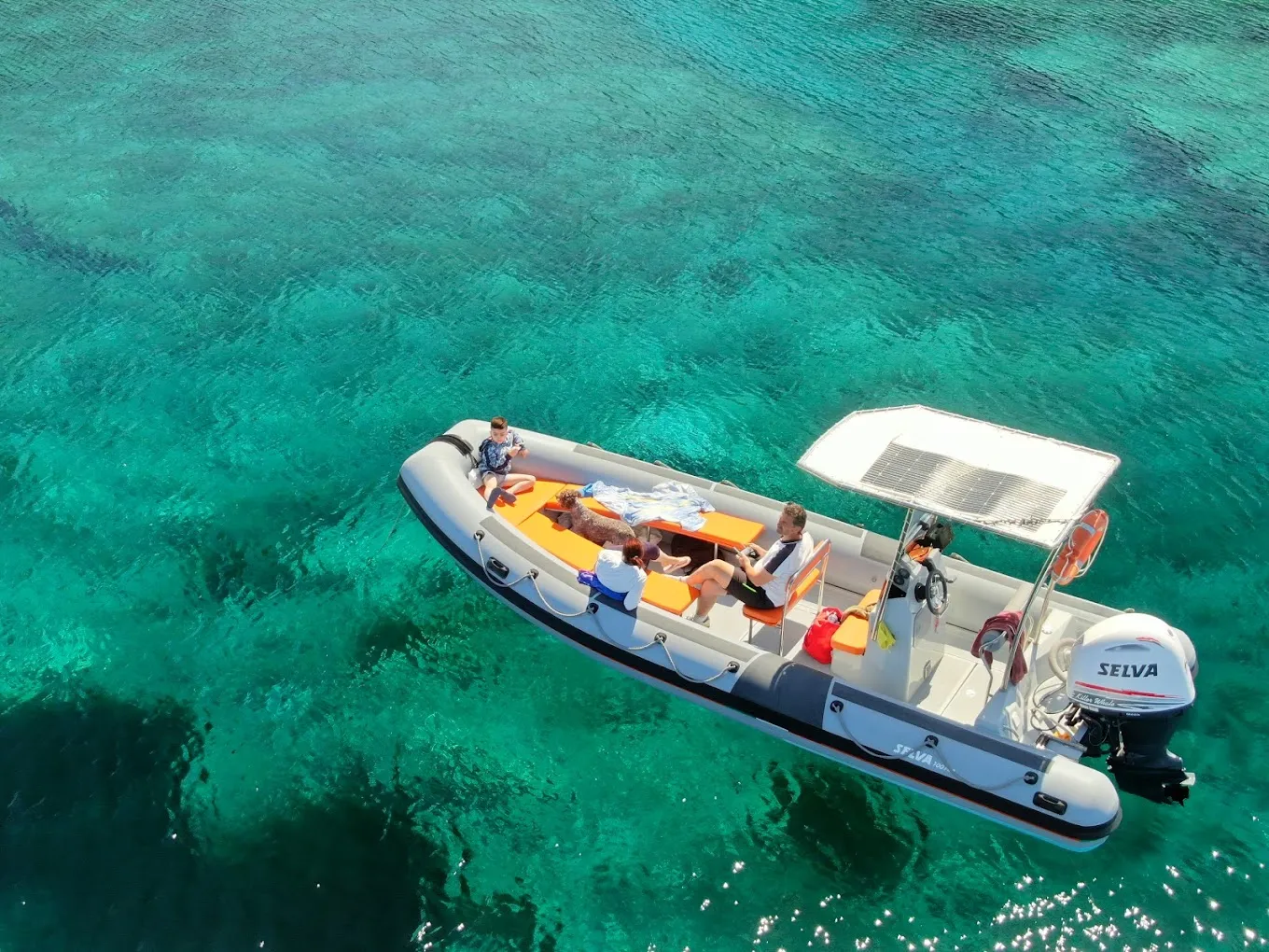 L'escursione in gommone elettrico include un aperitivo a bordo a base di salsiccia, formaggio e pane grattiau, accompagnati da vino o birra. La navigazione può essere organizzata in condivisione oppure in esclusiva e dura un'intera giornata.