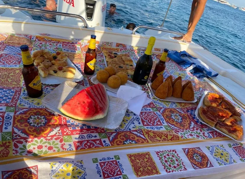 Durante l'uscita verranno effettuate alcune soste per fare il bagno in mare e vi verrà servito un aperitivo a base di prodotti tipici siciliani.