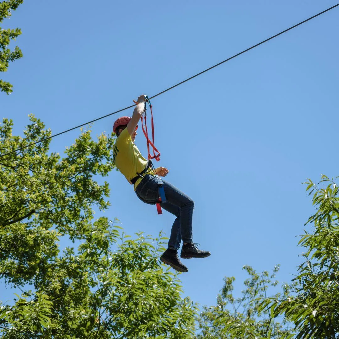 Questo percorso è perfetto per i più piccoli (dai 3 anni) ed è composto da 2 tyrolienne lunghe circa 45 metri e raggiunge un'altezza massima da terra di 2 metri circa.