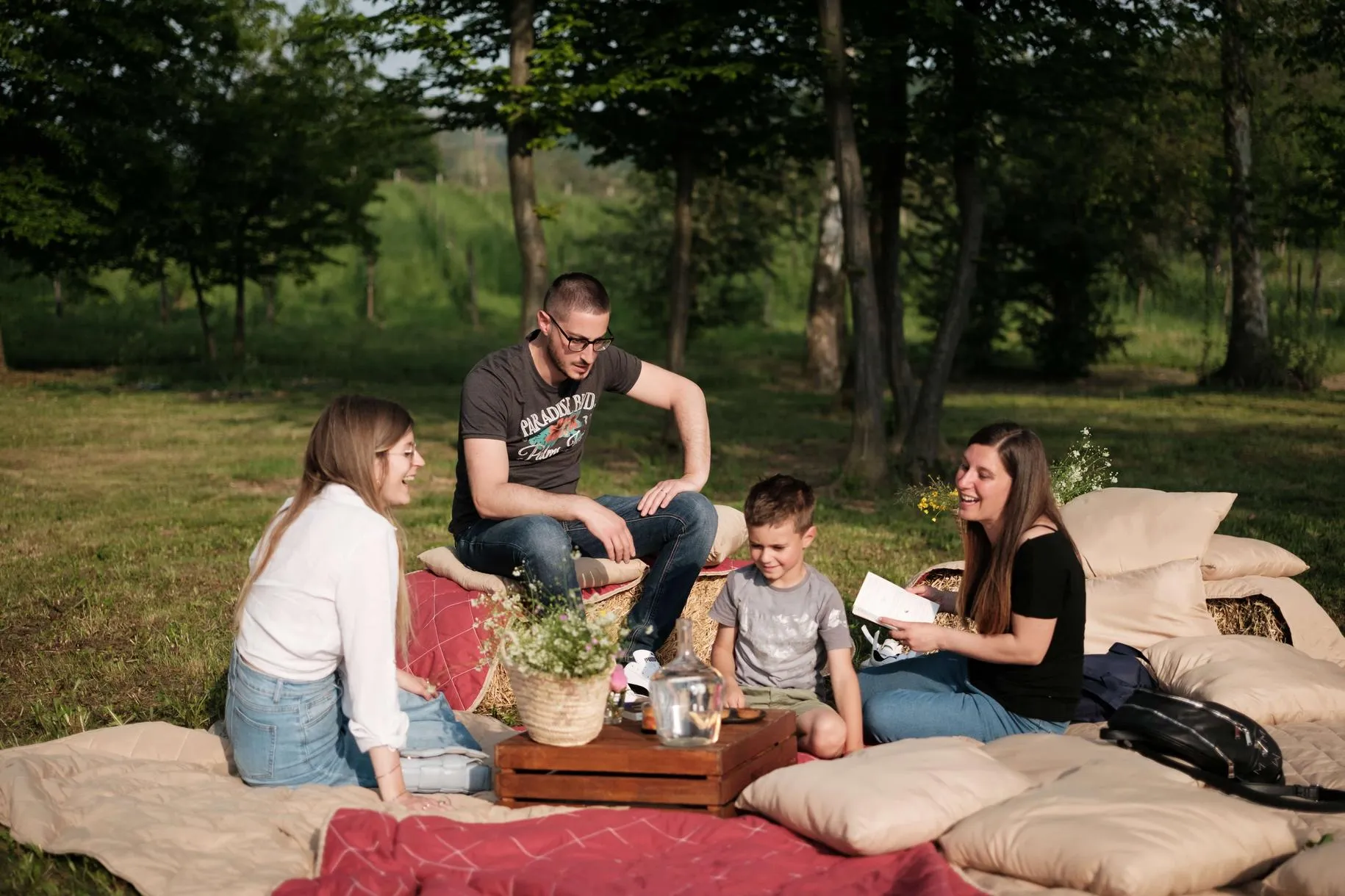 Troverete tutto il necessario per il picnic e aperitivo già in loco, dalla coperta ai cuscini, dai libri alle sedute.