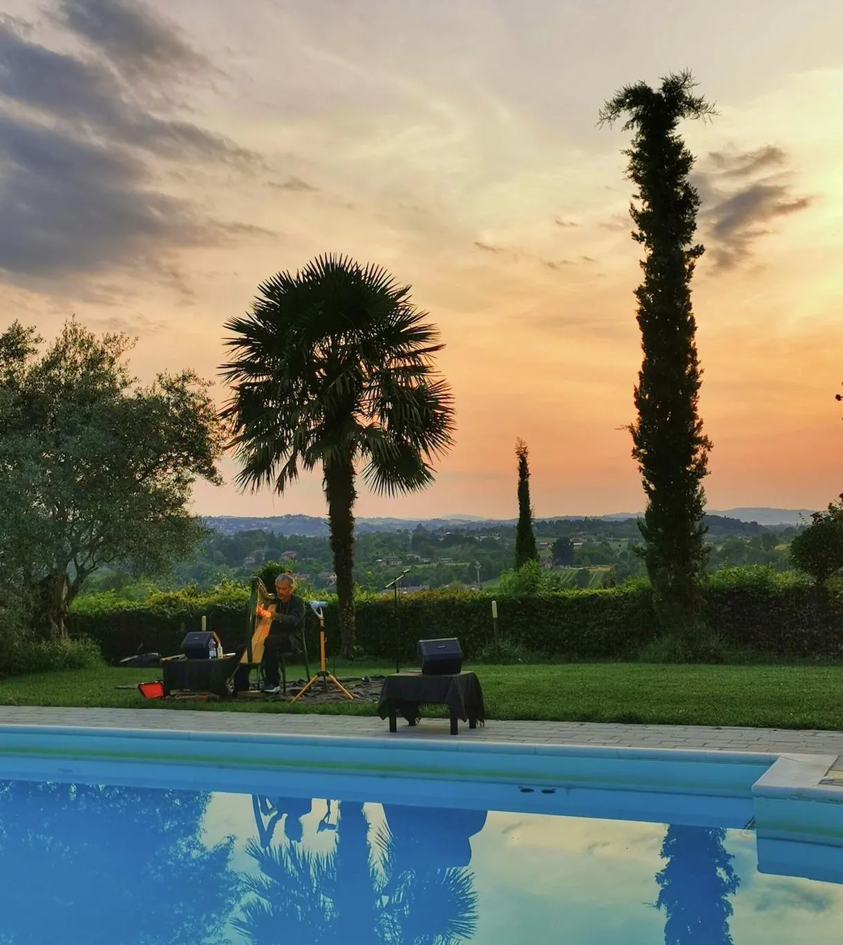 Successivamente potrete godervi un breve concerto a bordo piscina prima della cena tra gli uliveti. Durante la cena i musicisti continueranno a suonare e il menù tipico prevede: