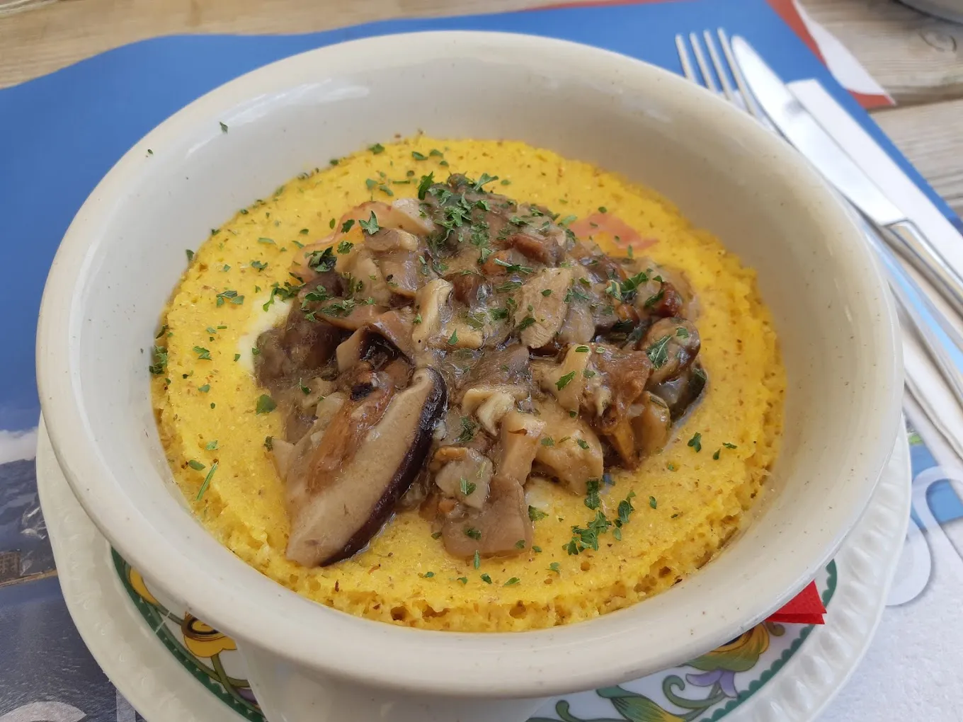 - Piatto unico: Polenta con cervo, formaggio cotto al forno e funghi delle valli.
