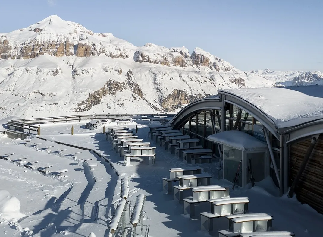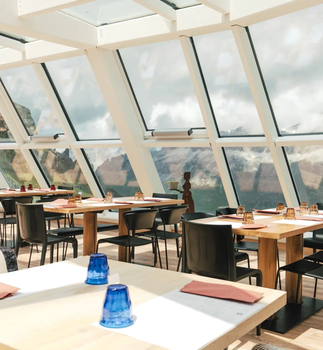 La struttura moderna e quasi interamente di vetro, permette di godere di una pausa dagli sport invernali o dalle passeggiate estive senza rinunciare ad ammirare il bellissimo panorama. Il particolare, il rifugio si sviluppa su due piani: al piano terra vi è il self service, mentre al primo piano il ristorante con il menù alla carta.