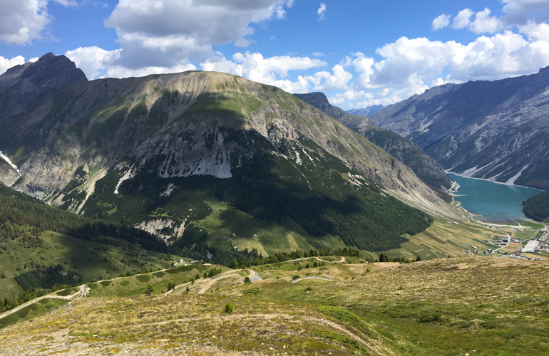 Vista dalla cresta della montagna, a destra il lago di Livigno, a sinistra la Val Federia